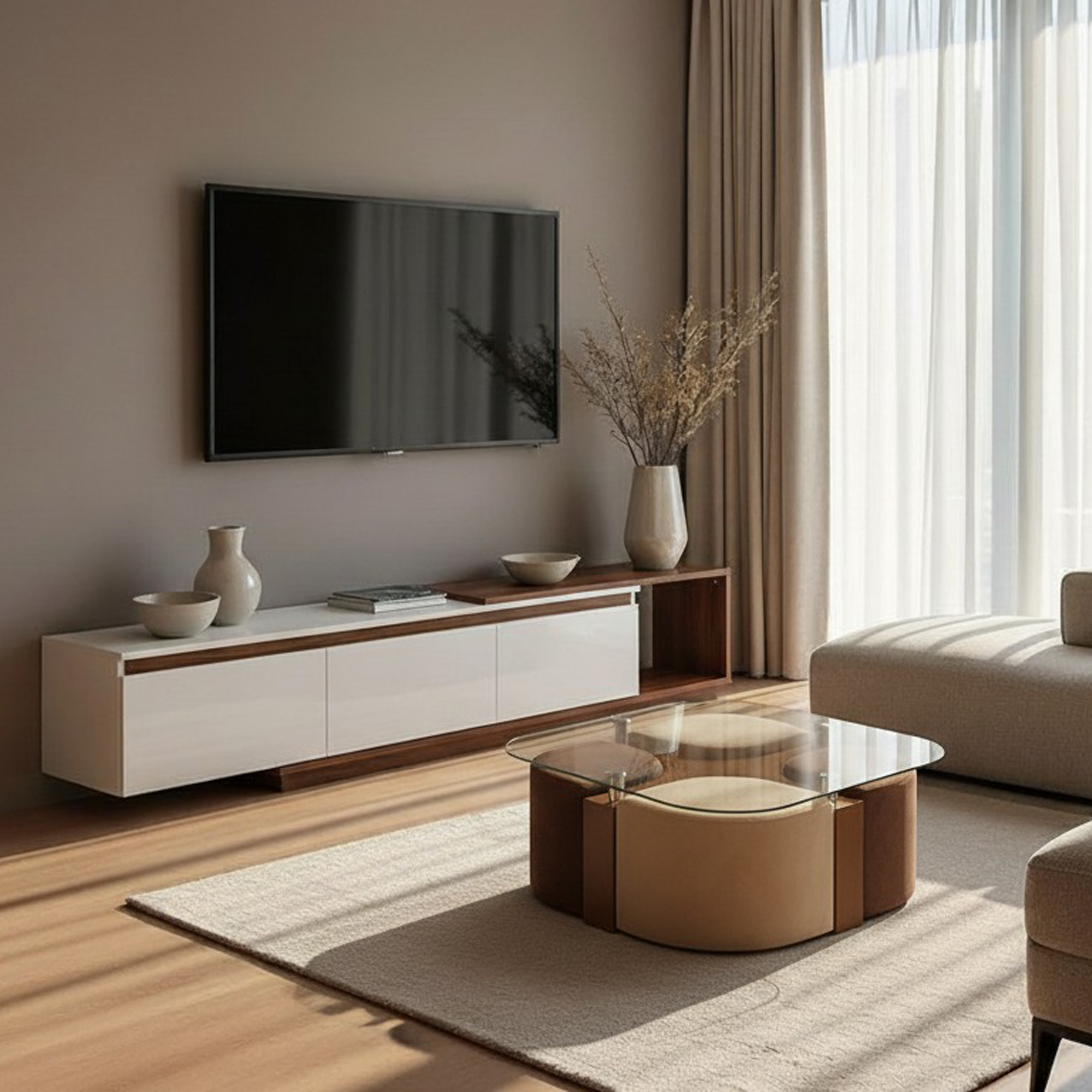 وحدة تلفزيون موديل Libra من Benourha – تصميم خشبي مع مكتبة جانبية عملية